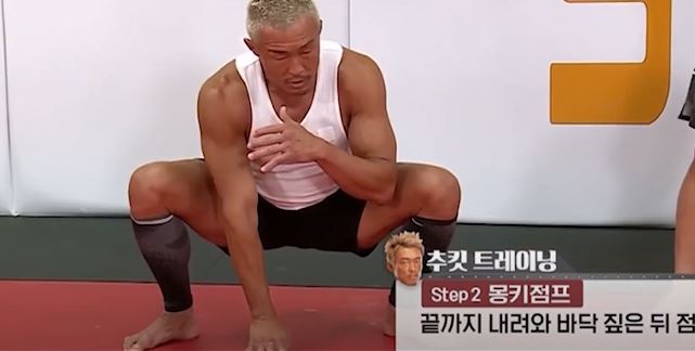 다음은 몽키 스쿼트, 와이드 스쿼트 자세로 최대한 밑까지 내려와서 한 손으로 바닥을 짚고 점프하는 것인데요. 점프를 할 때마다 손을 바꿔줘야 합니다. 이것 역시 한 번에 20개를 진행합니다.
