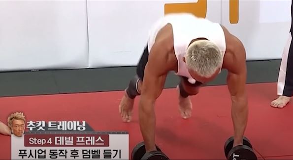 네 번째는 데빌프레스 자세입니다. 푸시업을 한 후 덤벨을 위로 드는 것인데 추성훈은 한쪽에 20킬로씩 40킬로를 들고 있지만 가벼운 아령이나 생수병을 들고 해도 효과가 있다고 합니다. 이것은 한 번에 10개씩 진행합니다.