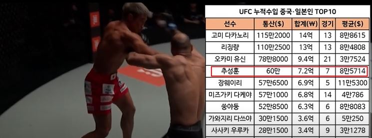 추성훈은 UFC 시절 다른 어떤 한국인 종합격투기 선수보다 많은 경기당 수입을 올렸다고 합니다.