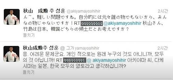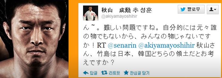 한 일본인이 '아키야마 씨 다케시마는 일본, 한국 어느 쪽의 영토라고 생각하십니까?'라고 묻자 '어려운 문제군요. 개인적으로는 원래 누구의 것도 아니니까 모두의 것 아닙니까!'라고 답했는데요.