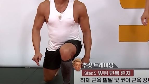 마지막으로 중간지점에서 쉬지 않고 앞뒤로 반복해 런지를 20개 진행하는 것입니다. 이렇게 다섯 동작들을 1세트로 하루에 4세트를 사이사이 쉬는 시간 없이 반복합니다.